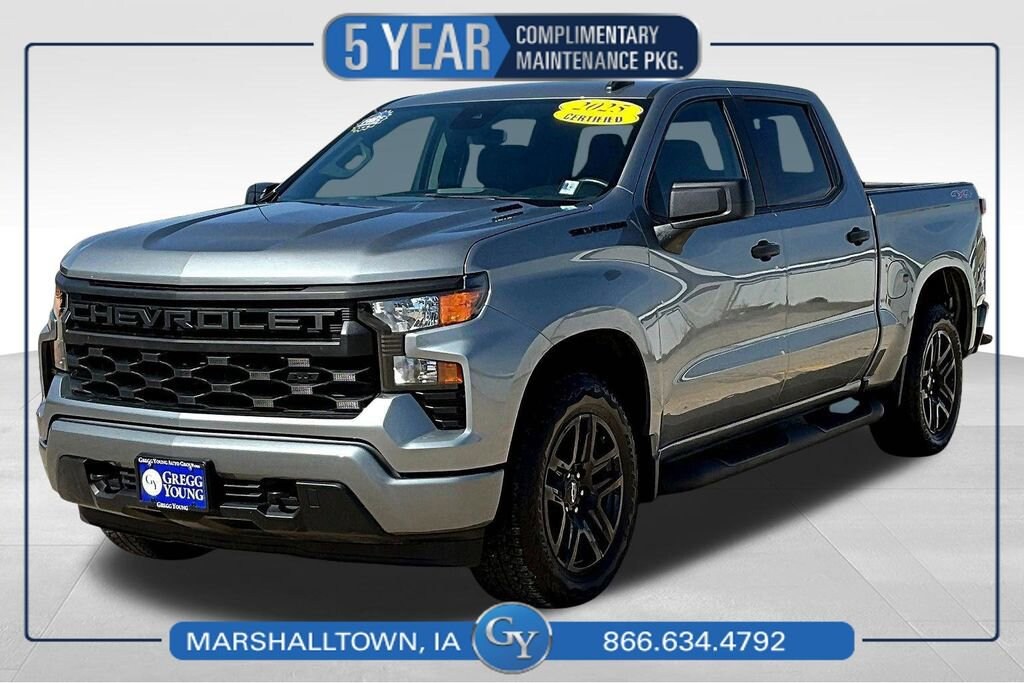 Our One Owner, Accident Free 2025 Chevrolet Silverado 1500 Custom Crew Cab 4X4 with the Blackout Pack in Sterling Gray Metallic is here to help with your next adventure! Motivated by a 2.7L TurboMax providing 310hp to an 8 Speed Automatic transmission to keep you on top of your game. This Four Wheel Drive truck also has a high-capacity suspension for heavier loads, and it returns nearly 21mpg on the highway. Upsized 20-inch alloy wheels help our Silverado 1500 stand proud as it welcomes you with LED lighting, a power lock/release EZ Lift tailgate, LED bed lighting, a 2-inch receiver hitch, black nameplates, black assist steps, a 120V outlet, and 20-inch high gloss black wheels.