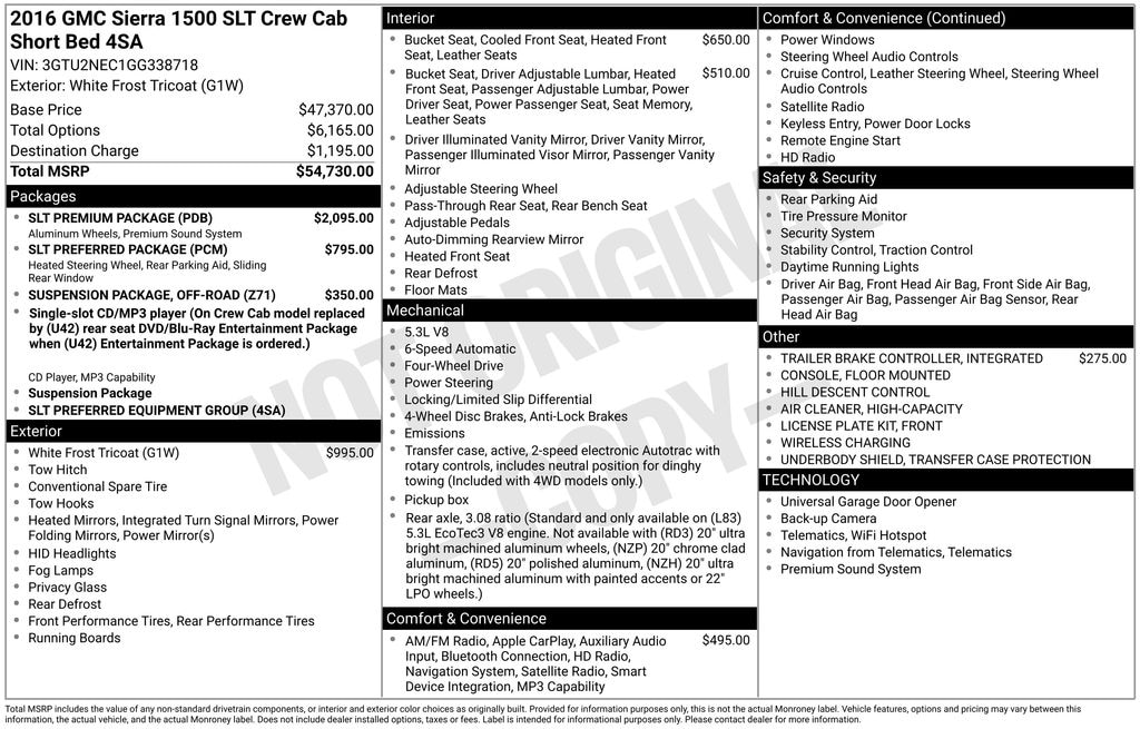 Confident and capable, the 2016 GMC Sierra 1500 SLT Crew Cab 4X4 in White Frost Tricoat is built to handle demanding work and play. Powered by a 5.3 Liter V8 EcoTec3 producing 355hp paired with a 6 Speed Automatic transmission to provide great hauling and towing capability. This Four Wheel Drive truck is also equipped to achieve up to 22mpg on the highway. Our Sierra SLT shows off projector-beam headlamps with LED signatures, running boards, and halogen fog lamps.